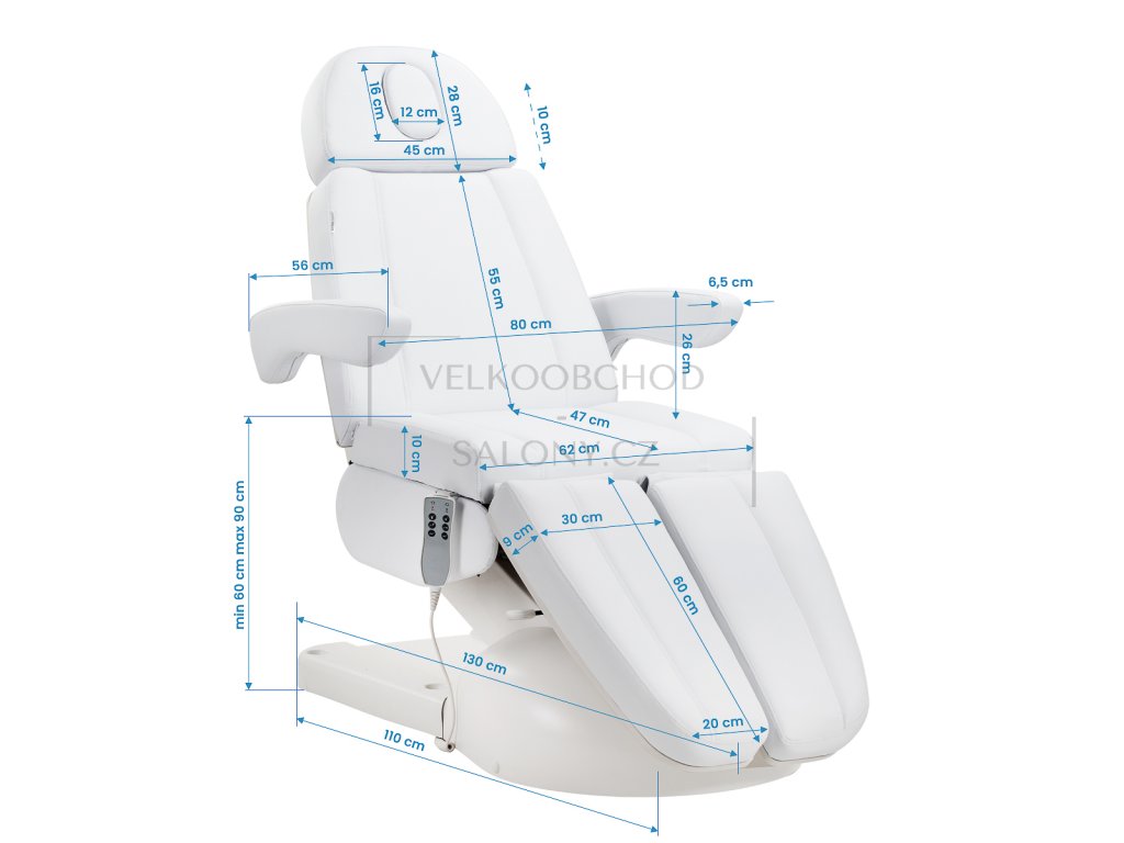 Výška sedadla je nastavitelná v rozmezí od 60 cm do 90 cm, což umožňuje pohodlné přizpůsobení polohy výšce klienta i osoby provádějící proceduru. Při úplném rozložení dosahuje křeslo délky 2 metry, což zajišťuje pohodlnou oporu těla – i při procedurách vyžadujících polohu vleže. Díky těmto parametrům se zařízení osvědčí při různých procedurách, jak kosmetických, tak specializovaných, a zaručuje ergonomii práce a vysoký standard obsluhy.